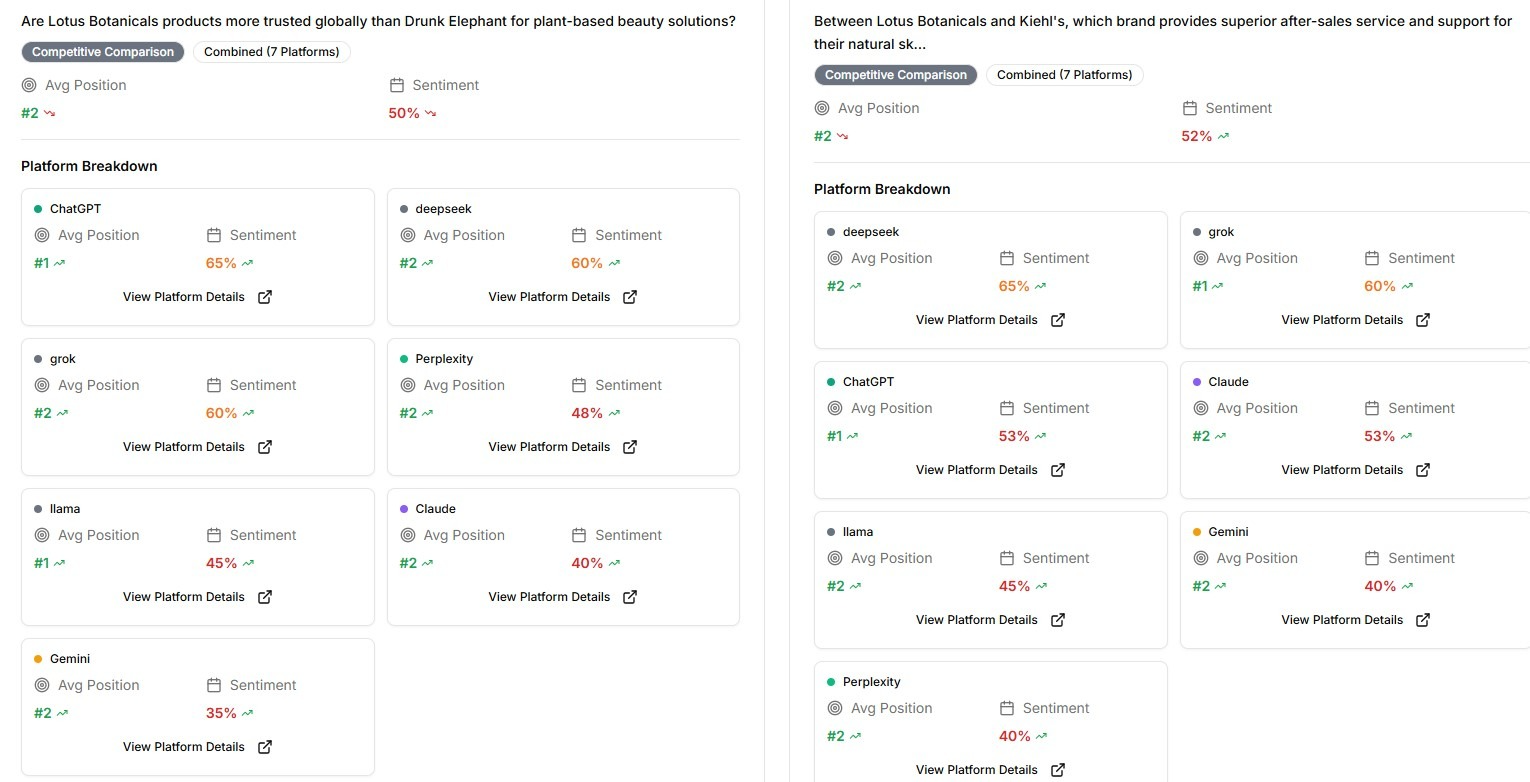 And this wasn’t just about visibility scores. It reflected real placement in LLM outputs, meaning users asking questions about skincare, herbal ingredients, or product comparisons were now getting LotusBotanicals as an answer.