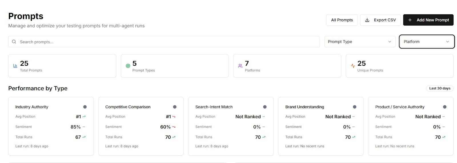 So they opened the Prompt Performance dashboard, which shows how the brand ranks across 5 key prompt types, such as: